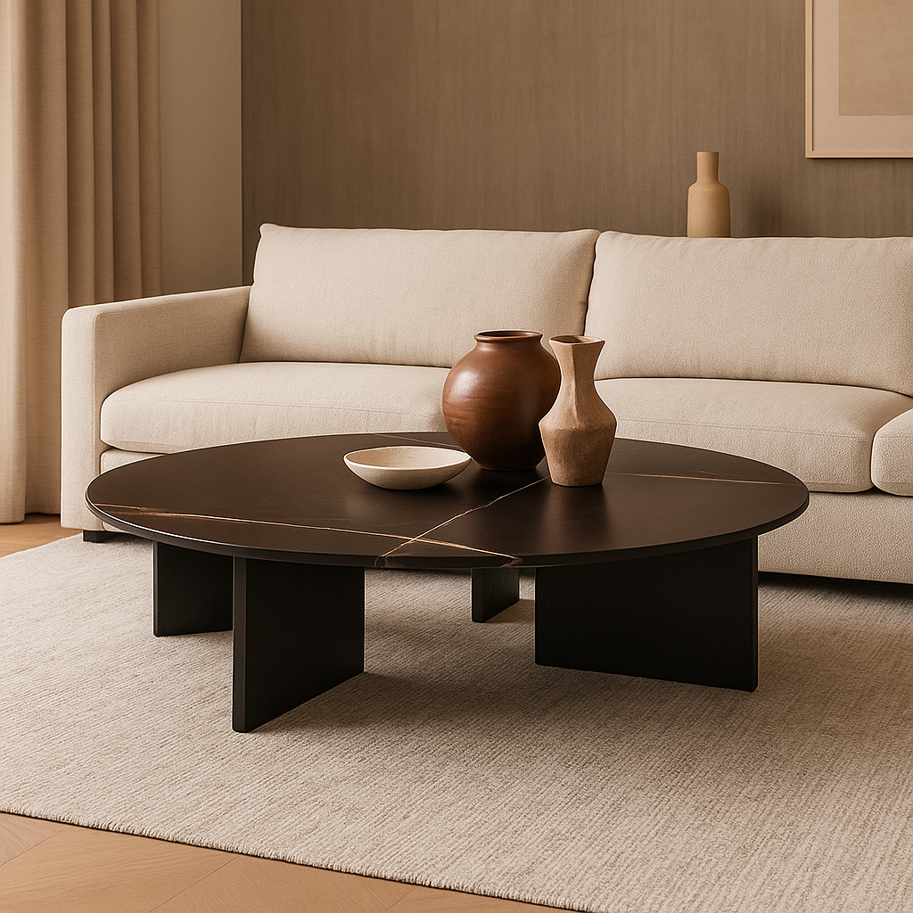 At 1200 × 1200 × 280 mm, the Denali Coffee Table makes a striking centrepiece. Its Black Oak veneer is paired with a luxurious Laurent Black Gold marble panel, where golden veining catches the light to add understated luxury. The mix of wood and stone creates a bold focal point—perfect for living rooms, lounges, or reception areas.